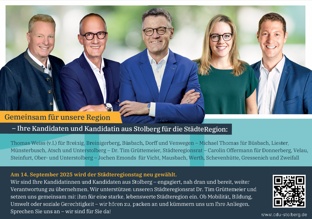 „Unterstützen Sie uns, Staedteregionsrat Dr. Tim Grüttemeier, und sein Stolberger Team. 4 Staedteregionstagskandidaten, die Sie seit Jahren kennen und die sich aktiv für Sie in den letzten Jahren eingesetzt haben. Denn Stolberg wird vor Ort gemacht, in Ihrem Stadtteil!"